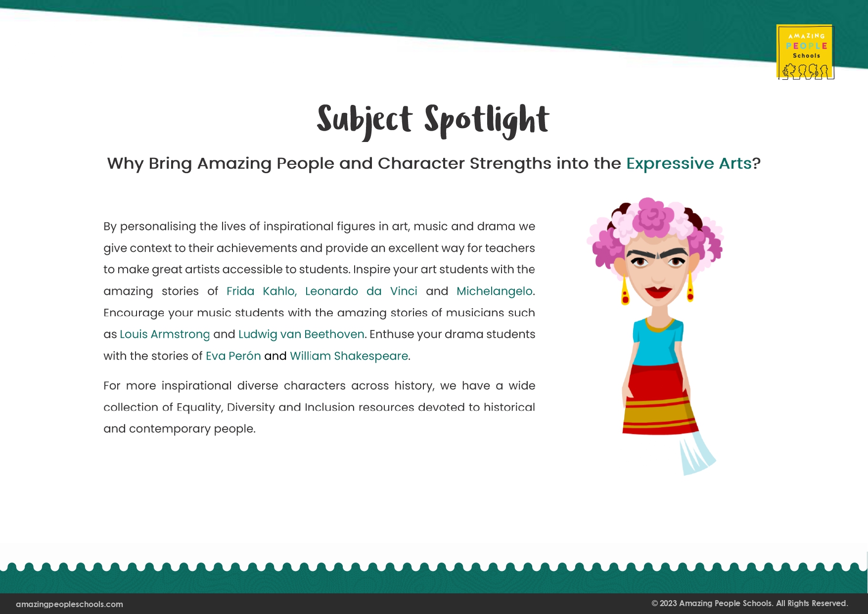 Amazing People Schools supports children and young people to recognise and represent feelings and emotions, both their own and those of others, through Expressive Arts. Resources encourage the development and application of character strengths, in particular creativity, curiosity, teamwork and open-mindedness, through the lives of Amazing People, such as playwright, William Shakespeare, artists Frida Kahlo and Michelangelo, and musicians Louis Armstrong and Beethoven.