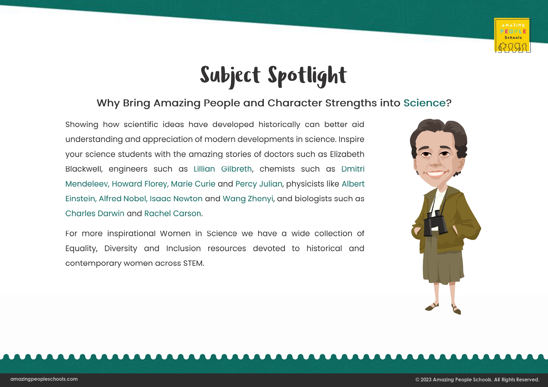 Amazing People Schools supports children and young people in the area of Sciences, to establish facts by inquiry, investigation and observation, and understand how the world works through the development and application of character strengths, such as adaptability, teamwork, resilience and perseverance. The lives of Amazing People who have used these strengths to problem-solve or overcome challenges and failures include Thomas Edison, Isaac Newton and Rachel Carson.