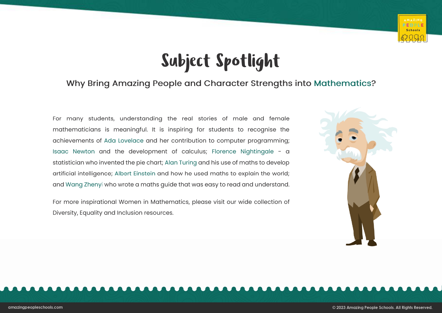 Amazing People Schools supports children and young people in the area of Mathematics and Numeracy through the development and application of character strengths, in particular adaptability, creativity, and resilience. Resources focus on the lives of Amazing People who have shown the ability to use mathematics and strengths to interpret and analyse information, and solve problems or to overcome challenges, such as Ada Lovelace, Alan Turing, Marie Curie and Albert Einstein.