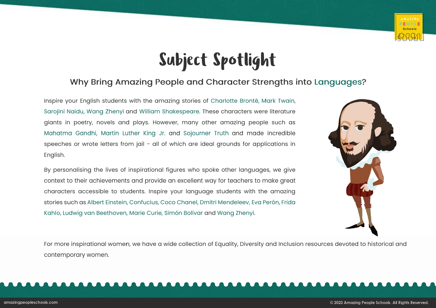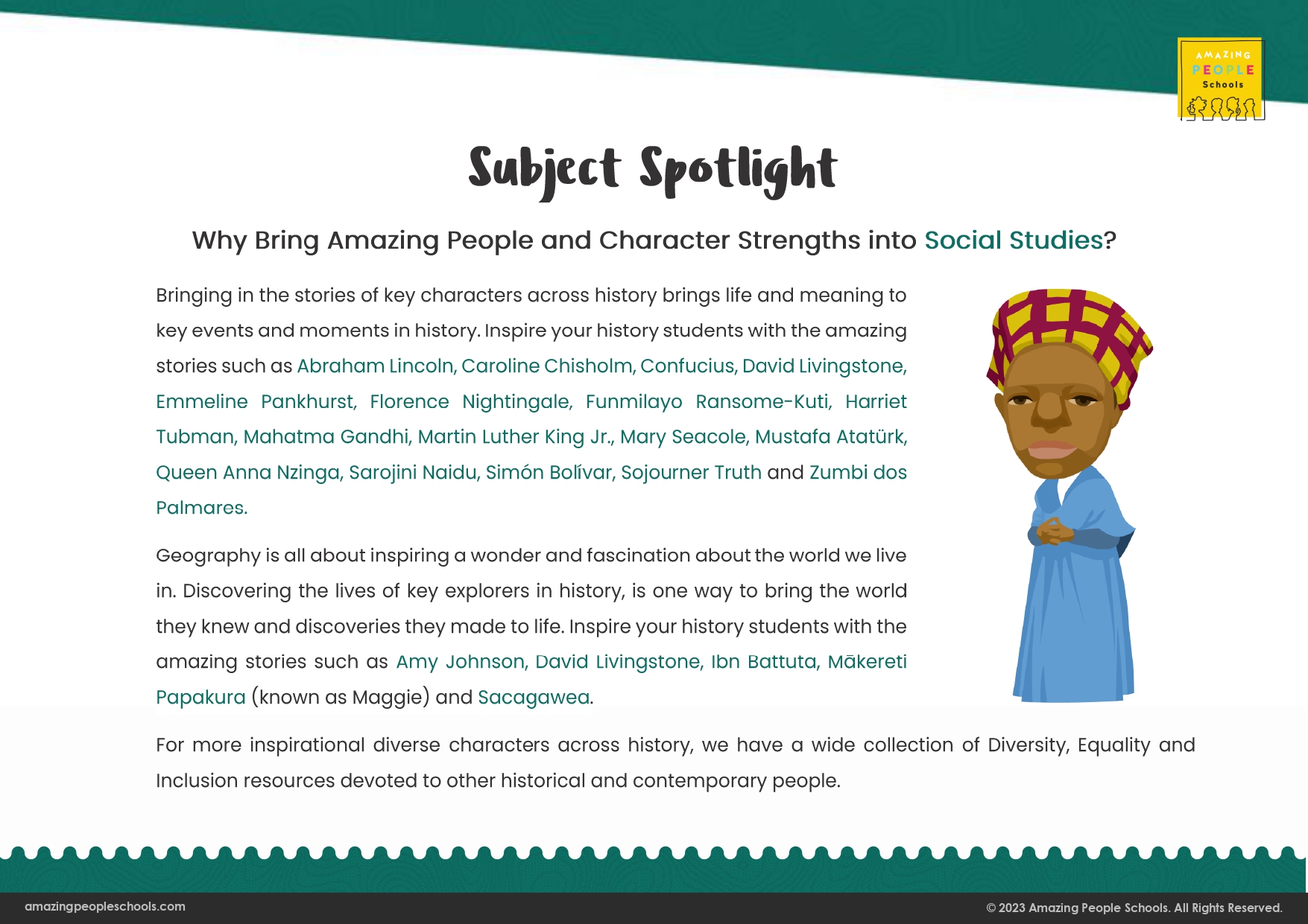 Amazing People Schools supports children and young people to develop their understanding of the world through Humanities by encouraging the development and application of character strengths, in particular integrity, teamwork, and curiosity. Resources focus on the lives of Amazing People whose actions have positively affected the lives of others and the environment, such as Aneurin Bevan, Rachel Carson and Martin Luther King Jr, and historical figures like David Livingstone.