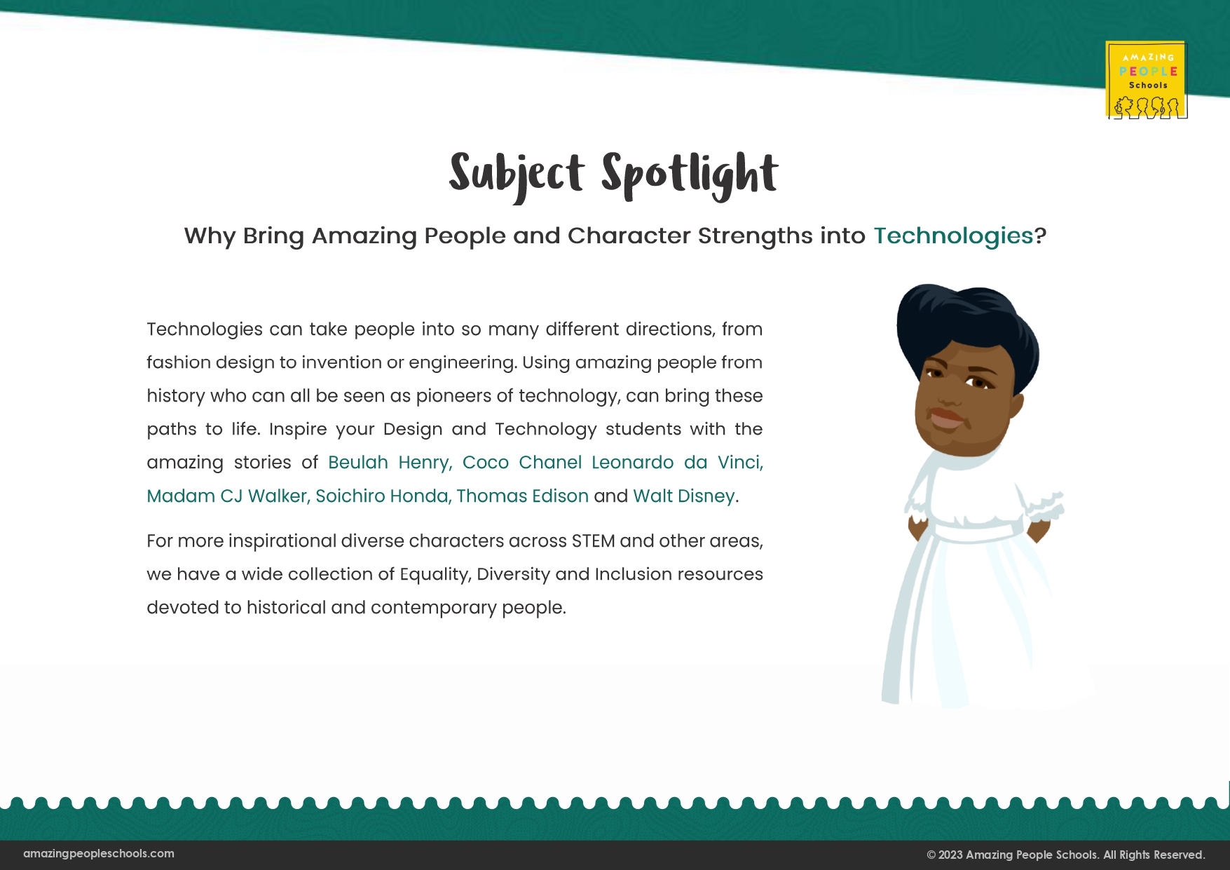 Amazing People Schools supports children and young people to develop skills, knowledge, understanding and attributes though the area of Technologies. Resources encourage the development and application of character strengths, in particular adaptability, optimism, curiosity and perseverance, and through the lives of Amazing People who have used these strengths to think critically and shape the modern world, such as Leonardo da Vinci, Thomas Edison, and trailblazers of business and industry, such as Madam CJ Walker and Beulah Henry.