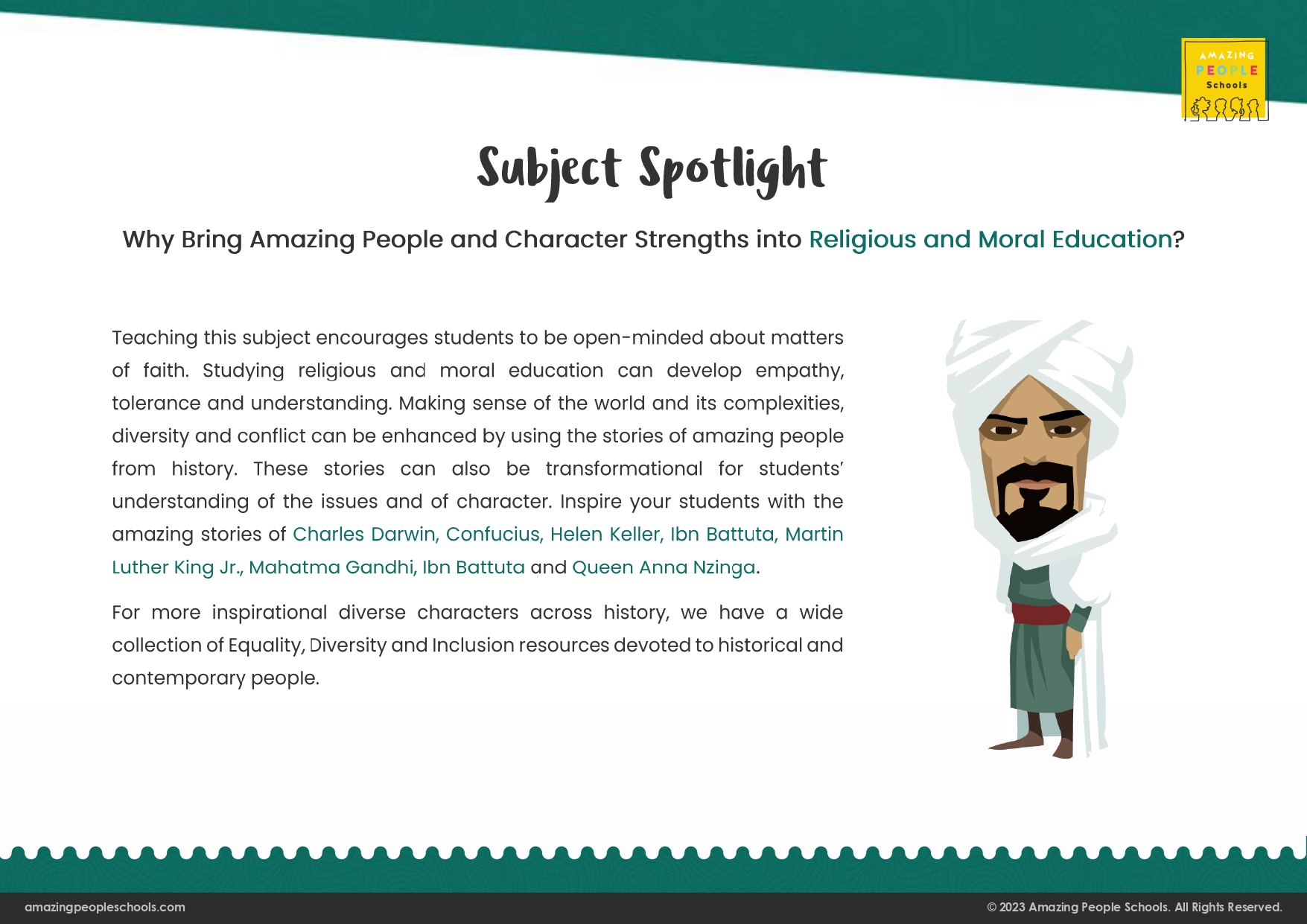 Amazing People Schools supports children and young people to explore the world's major religions and other belief groups through the development and application of character strengths, in particular open-mindedness, empathy and fairness. The lives of Amazing People, such as Charles Darwin, Mahatma Gandhi and Queen Anna Nzinga, will help them to develop a richer understanding of the world in which they live.