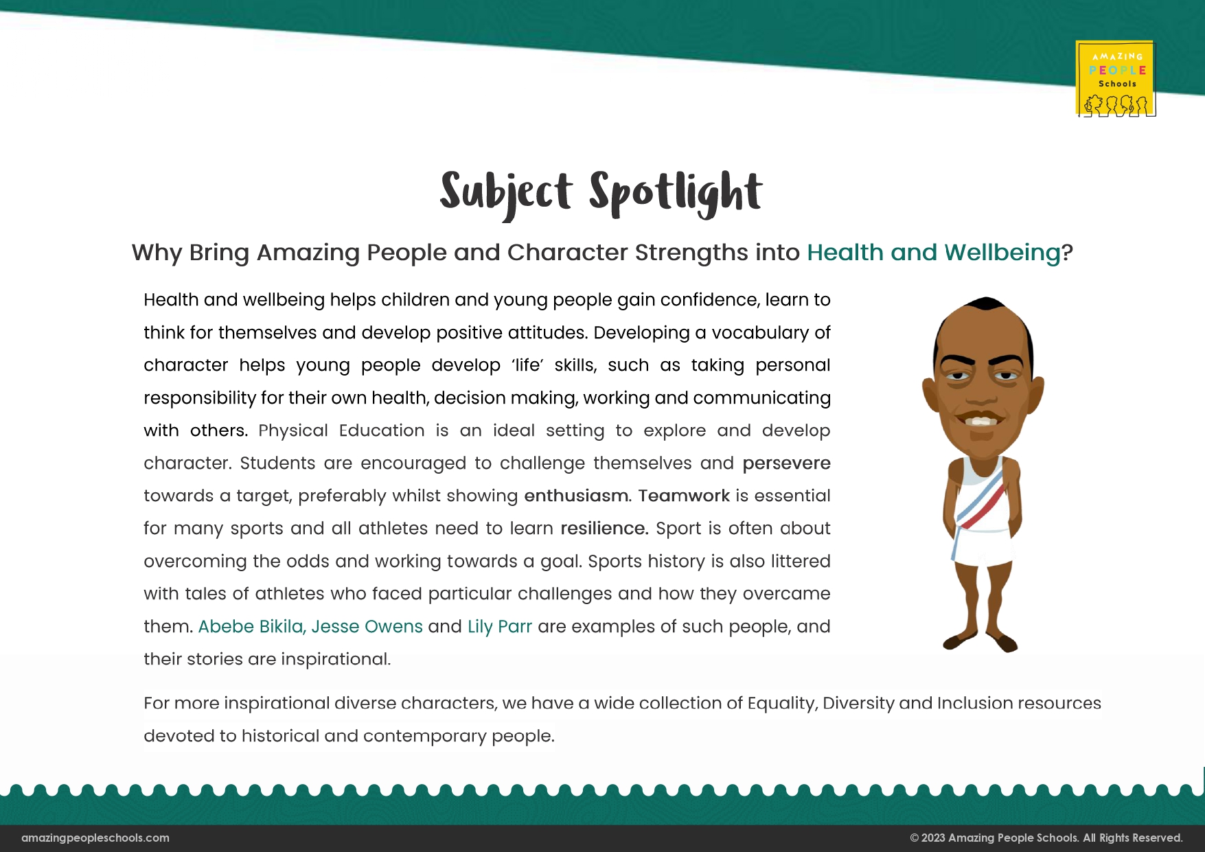 Amazing People Schools supports children and young people to cope with uncertainties in life, have confidence to try new and different things and make the most of opportunities that come along. Health and Wellbeing resources encourage the development and application of all character strengths, in particular perseverance, enthusiasm, and optimism, through the lives of Amazing People, such as Abebe Bikila and Lily Parr. Understanding how developing our strengths can lower anxiety and stress, increase self-confidence and improve our relationships, contributes to a toolkit of strategies for positive mental health.